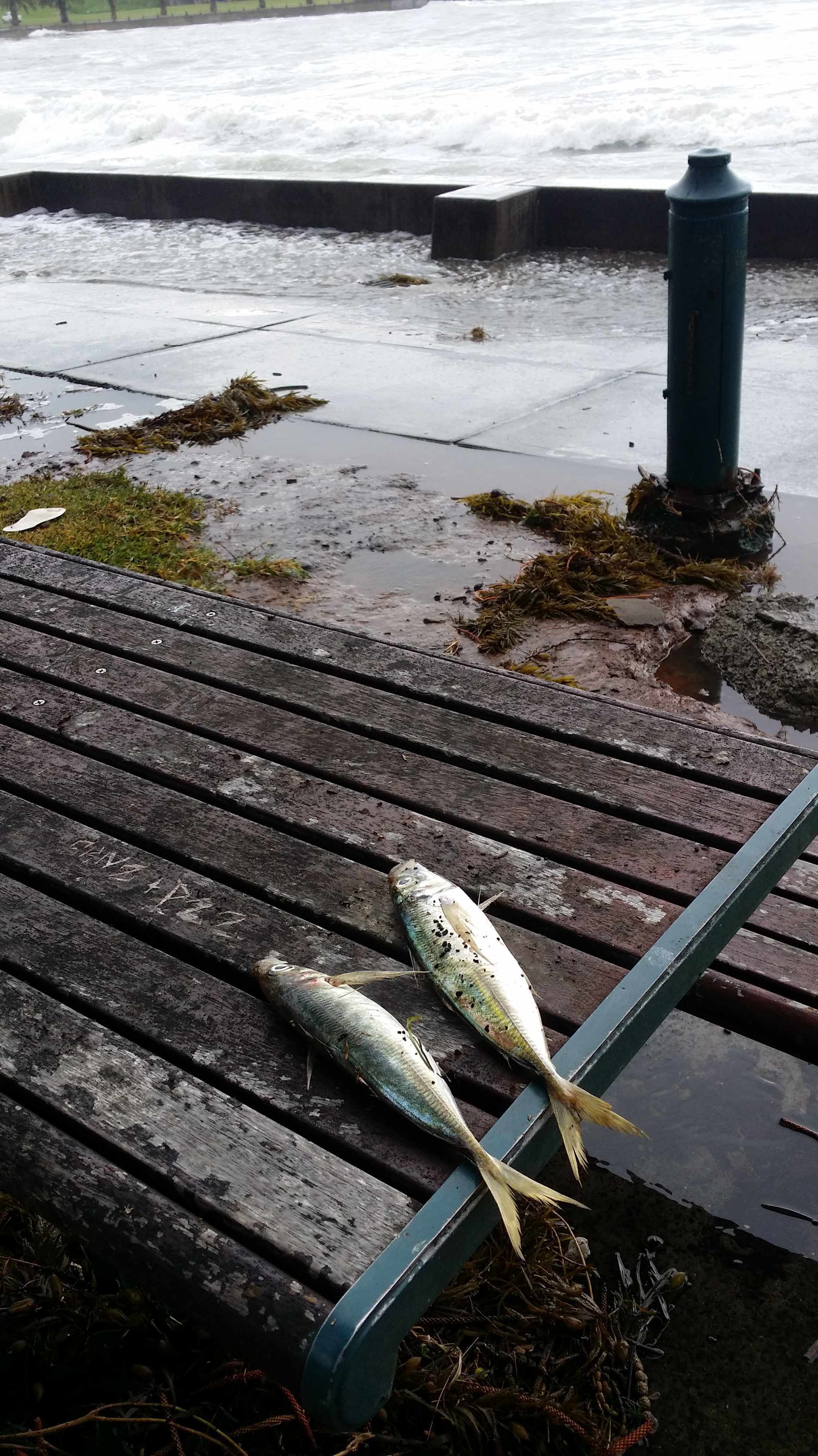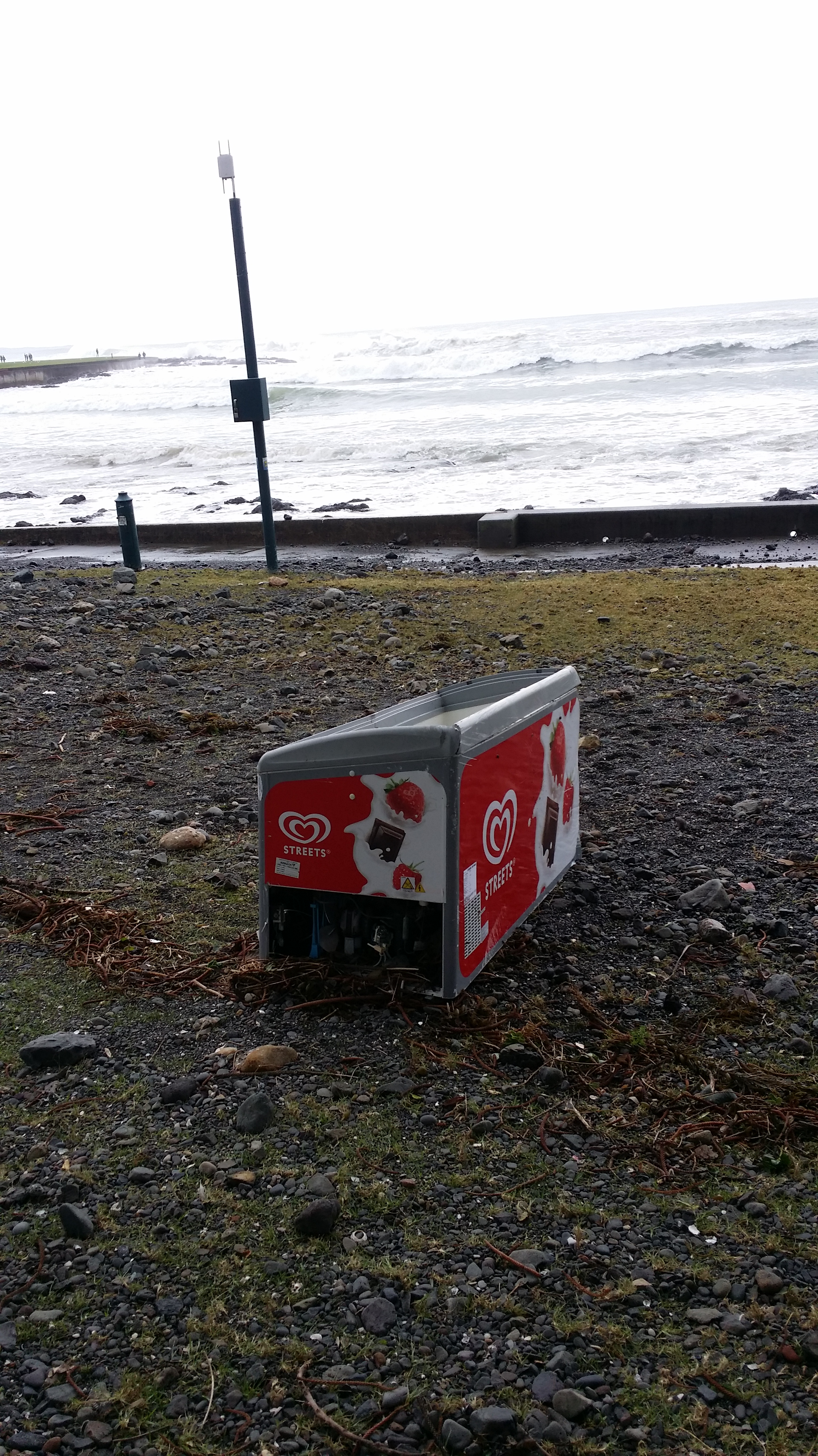 The tide and swell were so high they picked up this large freezer from the back of Cargos fish shop and washed it this far over the sea wall.