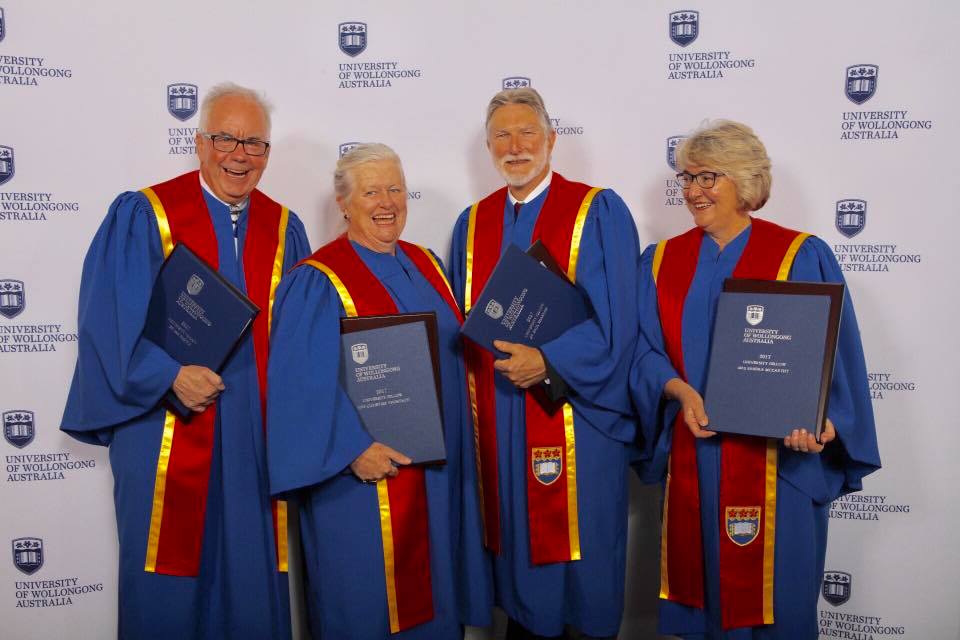 Emeritus Mayor Sandra McCarthy and Christine Thompson were honoured as Fellows of the University of Wollongong at a recent graduation ceremony. Mrs McCarthy received recognition for her long advocacy of healthy cities and local government, and Mrs Thompson for her work with the UOW Alumni, particularly raising funds for scholarships and awards through a bookshop.